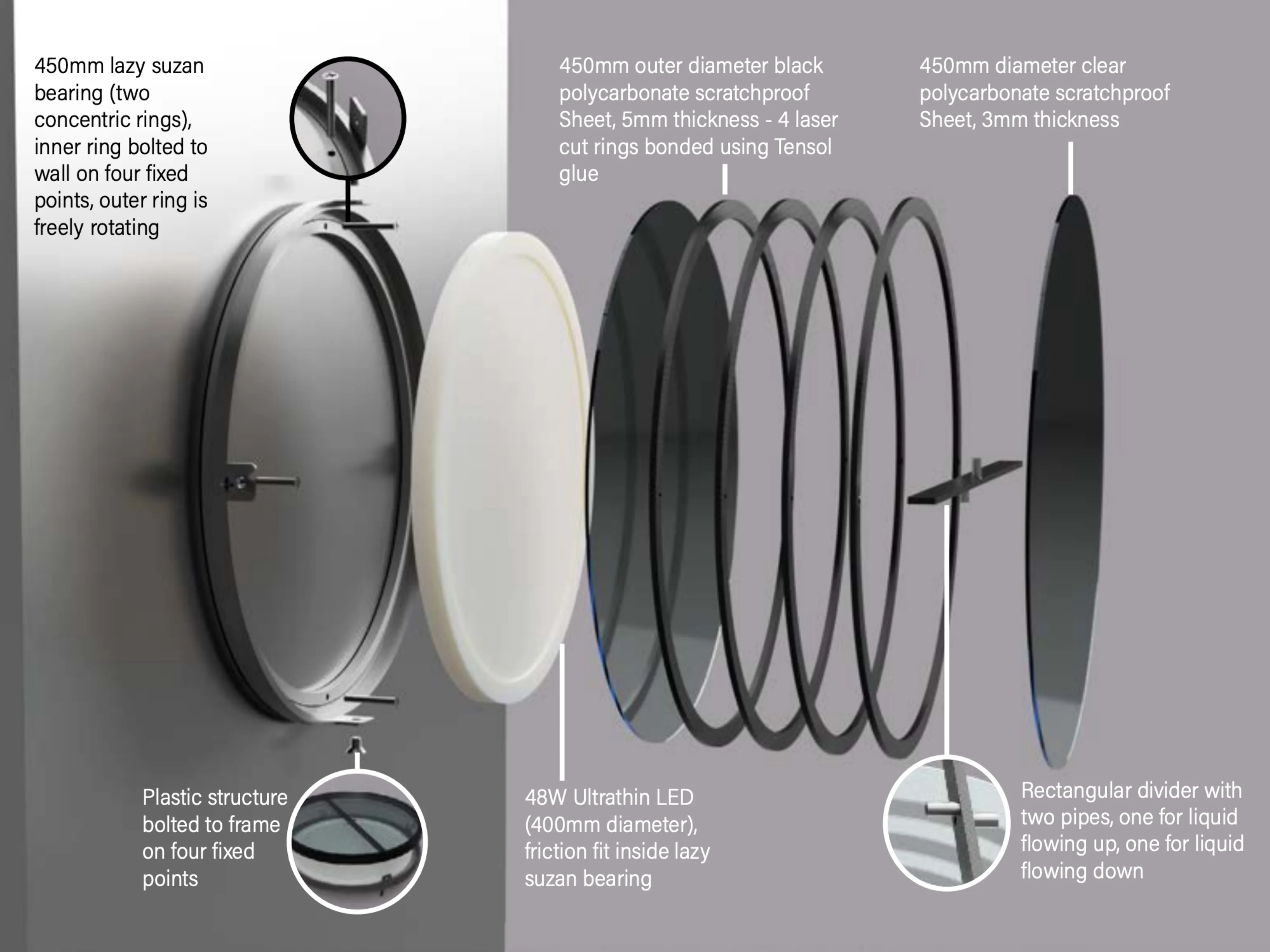 Developed fluid-mechanics-based lighting for public spaces. Engineered two-chamber water/oil system with rotating mechanics. Grade: Distinction.